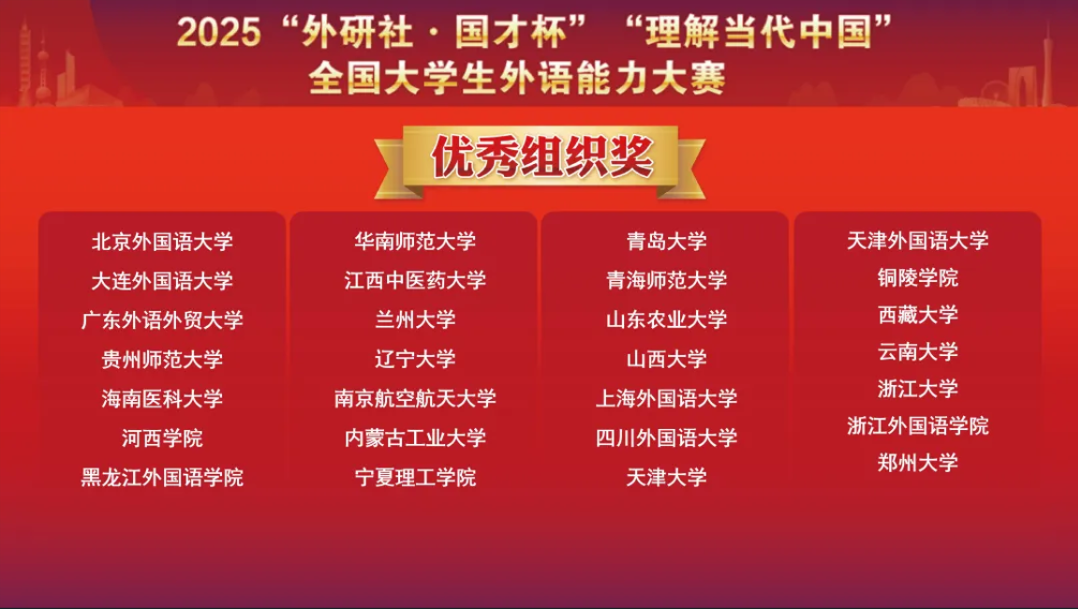 近日,2025“外研社·国才杯”“理解当代中国”全国大学生外语能力大赛全国总决赛在北京举行。郑州大学外国语与国际关系学院学生表现优异,斩获金奖3项、银奖7项、铜奖8项,创我校参赛以来历史最佳成绩。同时,郑州大学荣获大赛“优秀组织奖”,彰显了我校在外语人才培养方面的扎实基础与显著成效。