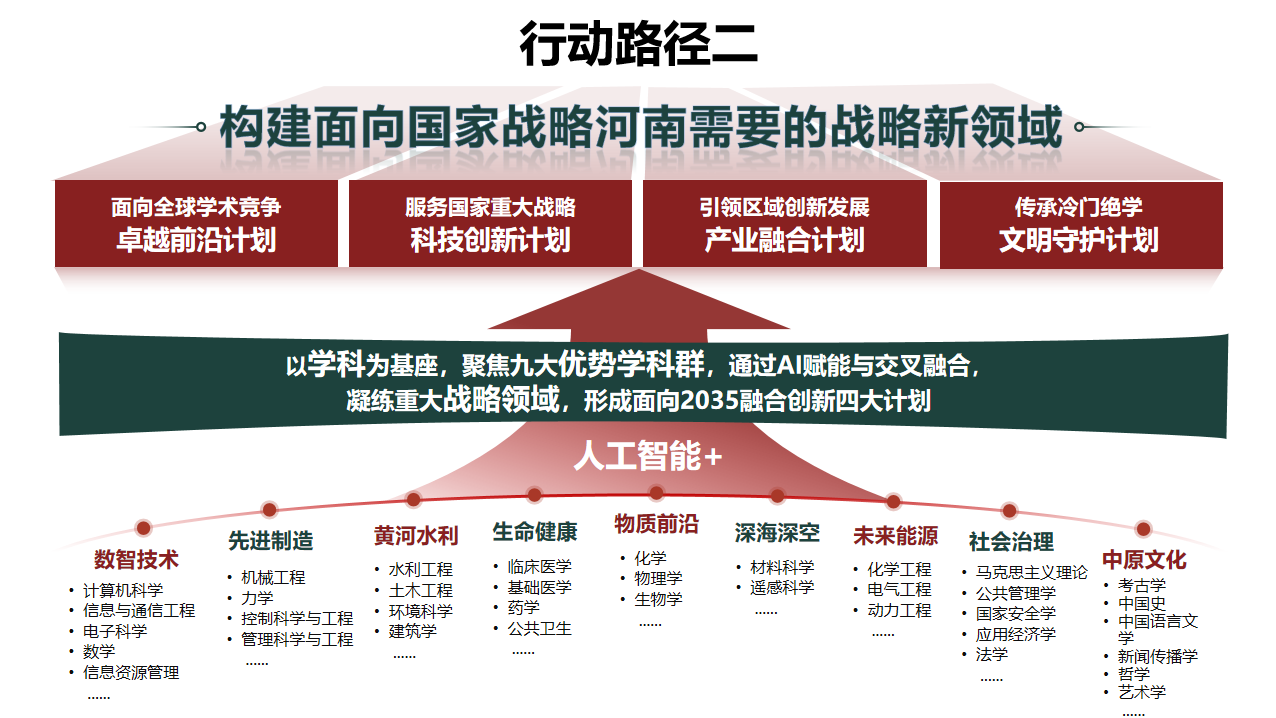围绕科技创新、产业发展、国家战略与河南需要,以学科为基座,聚焦九大优势学科群,通过AI赋能与交叉融合,凝练重大战略领域,形成面向2035融合创新“四大计划”。推进“面向全球学术竞争卓越前沿计划”,聚焦物质科学前沿、代谢与重大慢病防治等方向,力争2~3个领域达到世界前沿水平;实施“服务国家重大战略科技创新计划”,围绕中华文明探源、黄河生态保护与高质量发展等国家战略需求,推动3~5个领域融入国家战略科技力量体系;落地“引领区域创新发展产业融合计划”,对接河南先进制造、新能源等主导产业,培育4~5个具有产业驱动力的特色方向;开展“传承发展冷门绝学文明守护计划”,重点建设古文字与汉字文明、老庄哲学思想研究高地,推动中华优秀传统文化创新发展。