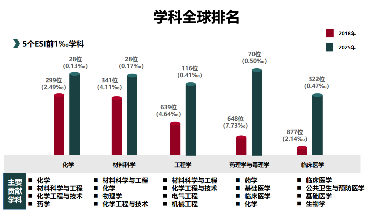 聚焦化学、材料科学与工程、临床医学3个一流建设学科,通过汇聚高水平人才团队、搭建高能级平台、强化有组织科研,打造具有显著竞争力的学科高峰集群。化学学科聚焦分子创新,依托抗病毒性传染病创新药物全国重点实验室,常俊标院士团队研发的“阿兹夫定”成为国内首个拥有自主知识产权的抗艾和抗新冠创新药物,为全球重大疾病防控贡献了中国方案。材料科学与工程学科面向国家战略材料自主可控,依托关键金属选冶与高纯制程全国重点实验室,聚焦高端靶材与航天特种材料,何季麟院士团队突破ITO靶材“卡脖子”关键技术,获国家技术发明奖二等奖;自主研发的航天员面窗关键材料性能达到国际领先水平,已纳入国家出口管制清单,有力支撑航天强国战略。临床医学学科服务“健康中国”建设,依托代谢紊乱与食管癌防治全国重点实验室,着力构建高水平医教研融合体系,围绕重大慢性病、新发突发传染病等开展前沿攻关,在智能诊疗、再生医学等领域取得系列突破,显著提升重大疾病防治能力与区域医疗服务水平。