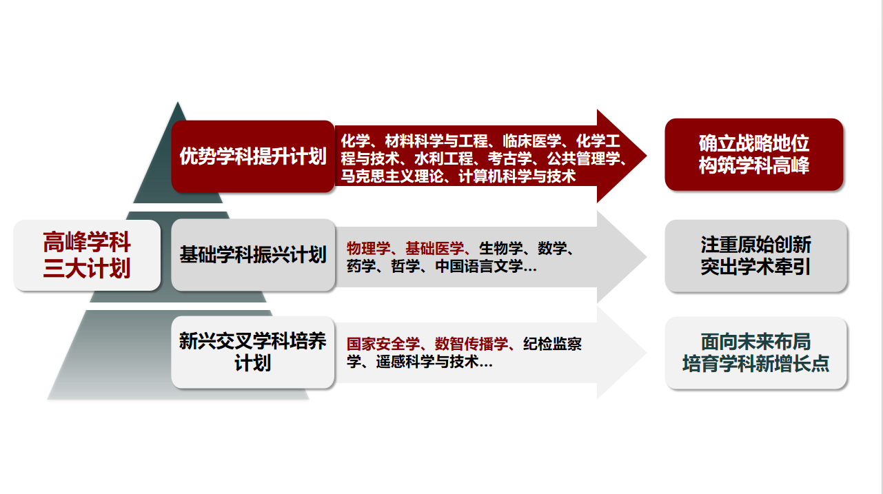 一是实施“三大计划”。通过优势学科提升计划打造高峰、基础学科振兴计划夯实创新根基、新兴交叉学科培养计划培育增长,围绕9个优势学科成立学科建设创新中心,以“学科+”理念汇聚主干学科与支撑学科优势资源,形成一流建设学科牵引,优势学科和特色学科助推,传统学科、新兴学科、交叉学科协同并进的发展布局。