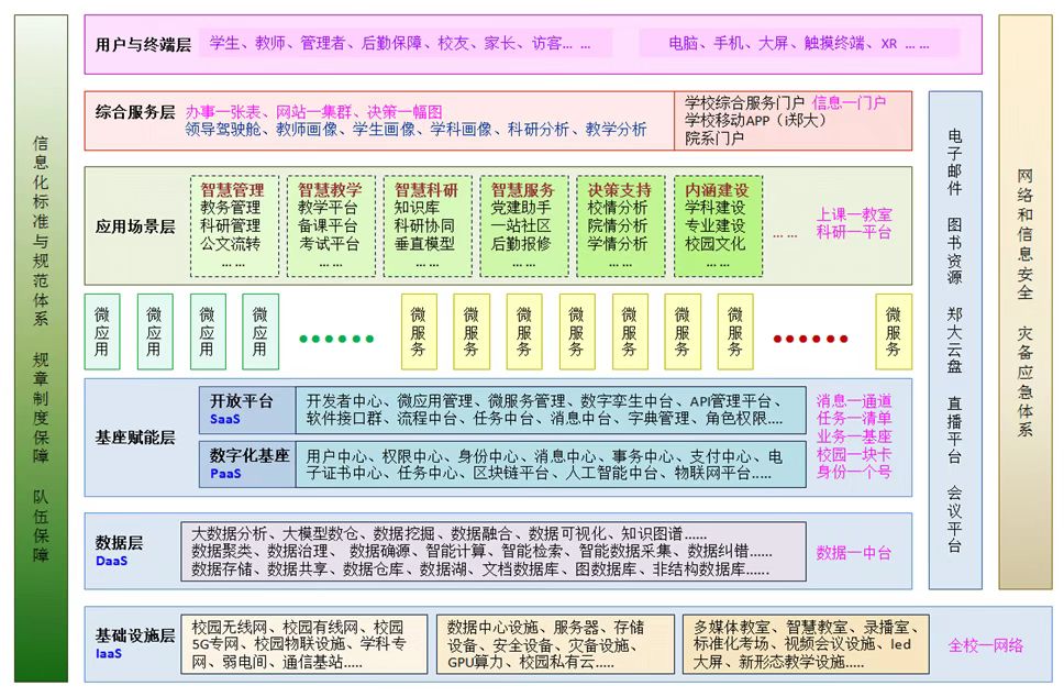 信息化工作以“支撑大学治理体系和治理能力现代化”为目标,扎实推进“数字化校园”建设。一是基础能力大幅增强。CPU核心数从1.05万提升至3.4万核心,内存从10TB扩容至73TB,存储从2.3PB增长至7.2PB,实现数倍增长,校园网完成光网改造,“四网”融合率达到95%,奠定坚实数字基座。二是应用生态日益丰富。建设微服务174个、微应用136个、办事和服务流程572个,校级应用软件系统和平台达到106个,基本实现各业务板块管理数字化,全面服务师生教学科研生活。三是数据治理与AI应用初见成效。建成学校数据中台,治理54个关键系统数据,发布丰富的数据清单与接口;自主构建AI大模型农场,提供30多个主流模型服务,访问量达45.1万人次,“智慧大脑”不断进化。四是智慧教育示范引领。建设“地方高校101计划课程和学习示范平台”,融合AI大模型等技术探索个性化教学,入选河南省“人工智能+高等教育”典型应用场景案例;建成“河南省高等学校人工智能学习教育平台”,48所本科高校完成身份对接,面向全省高校开放,服务能力不断深化拓展。五是网络安全坚实稳固。建成并运行校园网络安全运营中心,完善舆情监测与网络安全协同机制,有效保障校园网络空间安全。