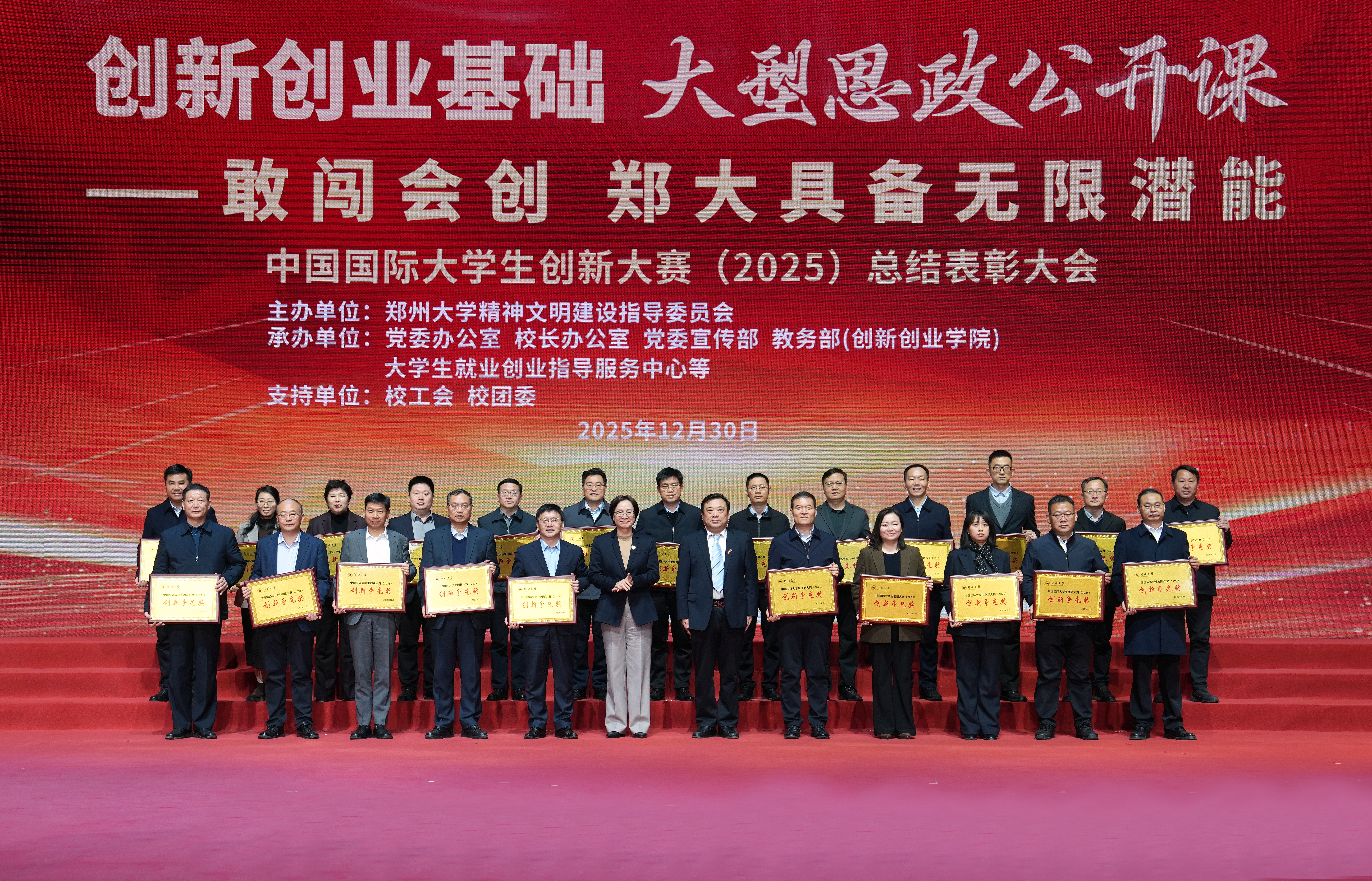 为深入落实立德树人根本任务,全面总结国创赛育人成果与办赛经验,表彰先进典型、凝聚奋进力量,并对2026年大赛进行动员部署,2025年12月30日晚,中国国际大学生创新大赛(2025)总结表彰大会暨“敢闯会创——郑大具备无限潜能”大型思政公开课在郑州大学主校区中心体育馆举行。全体在校校领导,省教育厅、郑州市教育局有关部门负责同志出席,大赛各专项组成员、金奖项目师生代表、志愿者及师生代表约1000人现场参加,活动同步线上直播,打造了一堂气势恢宏、形式多样、内容丰富的思政“金课”。