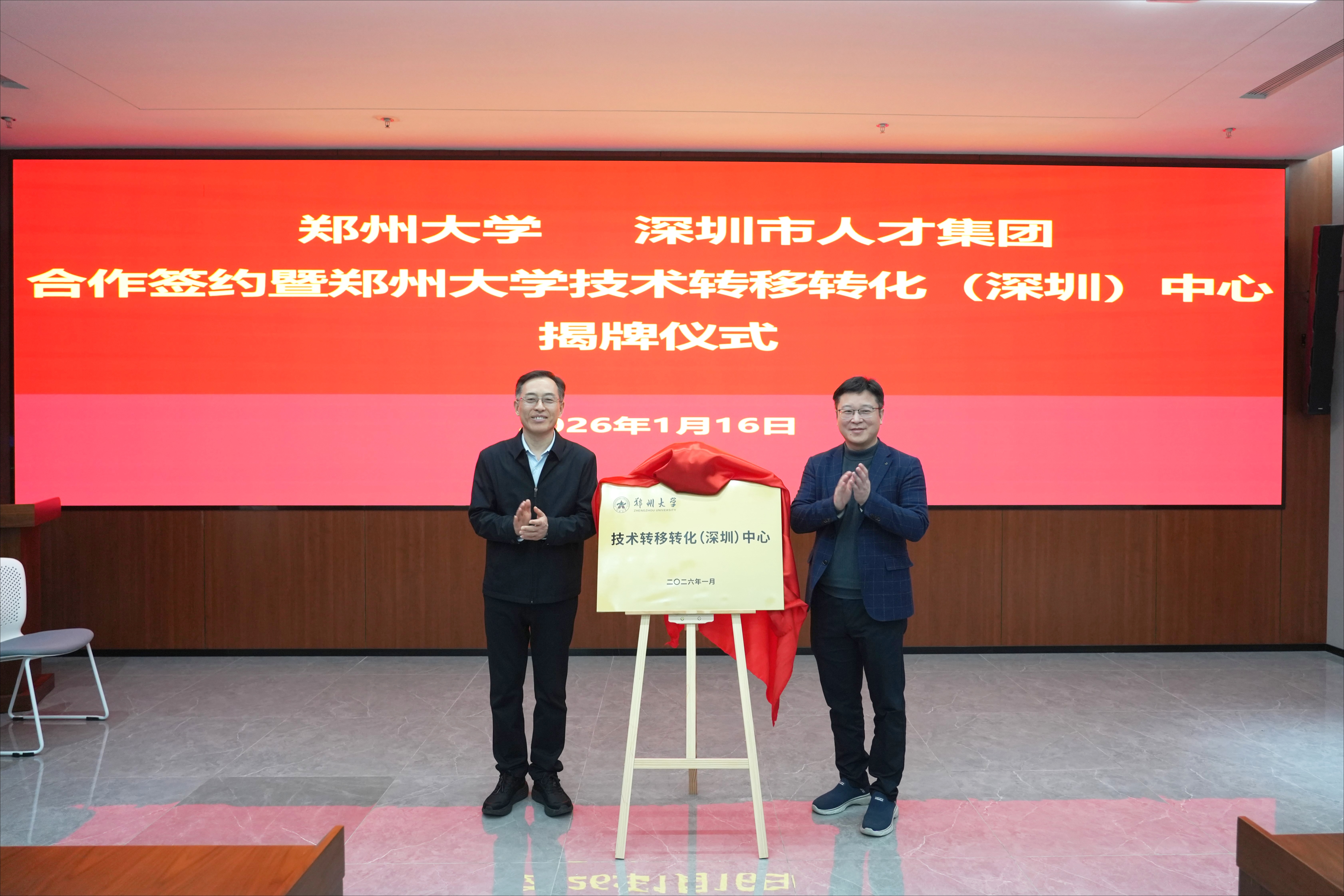 仪式上,双方代表签署合作协议,李成伟、高大伟共同见证签约,并为“郑州大学技术转移转化(深圳)中心”揭牌。