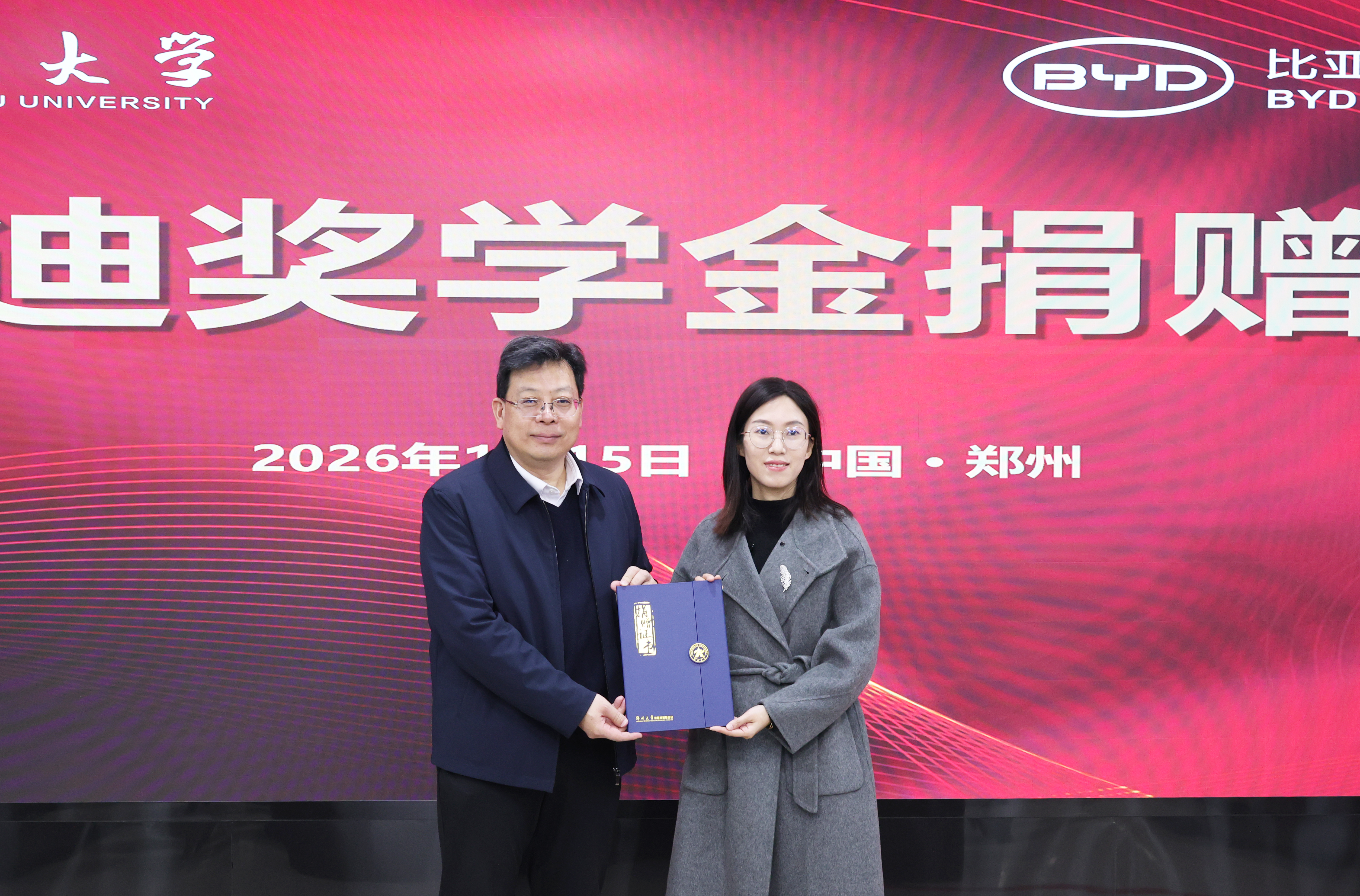 近日,郑州大学2025年“比亚迪奖学(教)金”捐赠暨发放仪式在主校区举行。校党委副书记王利国,比亚迪集团人力资源处地区四部人事总监陈静出席仪式。比亚迪郑州园区招聘主管,郑州大学校友总会办公室、大学生就业创业指导服务中心负责同志及获奖师生参加活动。