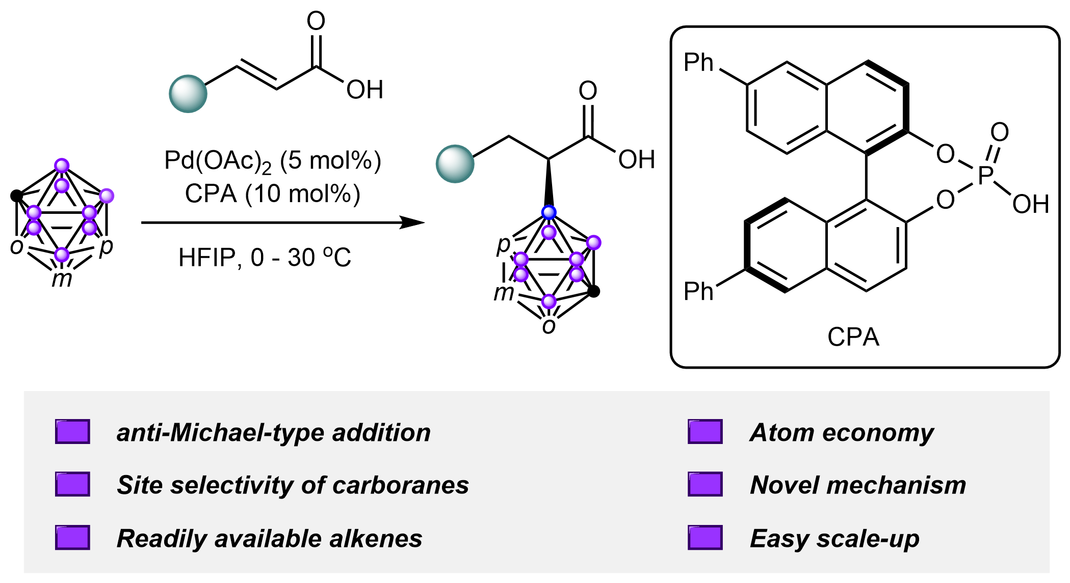 近日,郑州大学化学学院在碳硼烷不对称B-H键活化研究领域取得积极进展。该研究利用钯/手性磷酸协同催化策略,创新性地实现了碳硼烷对α,β-不饱和羧酸的不对称反Michael加成,即碳硼烷加成在了羧基的α位。