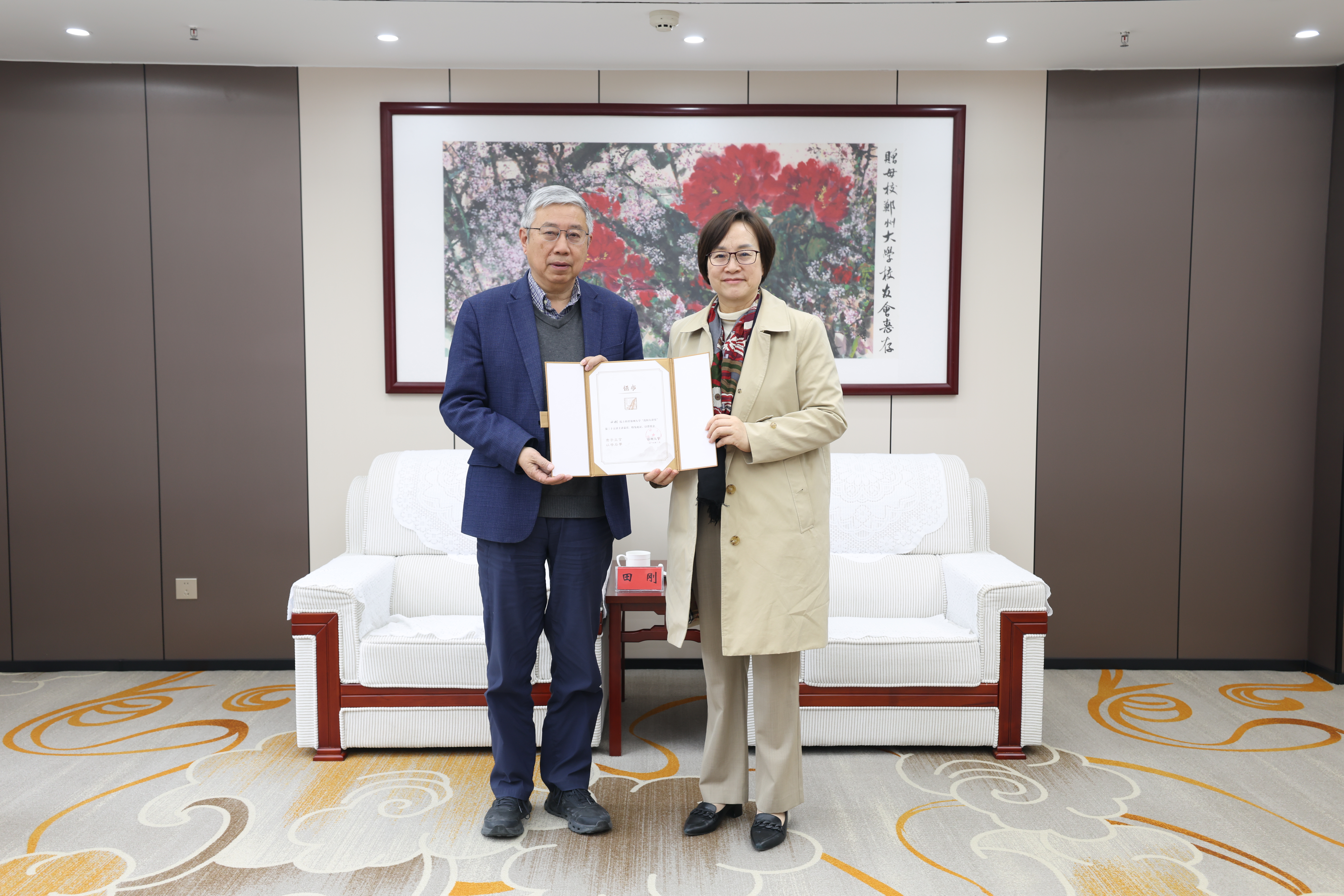 报告开始前,校长李蓬院士为田刚颁发“嵩阳大讲堂”主讲嘉宾证书。